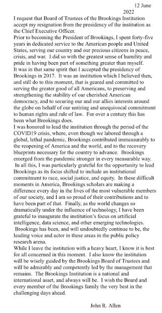 The Brookings Institution's president, retired four-star Gen. John R. Allen announced that he is resigning from the organization amid a federal investigation into his alleged role doing illegal foreign lobbying work for Qatar. Allen was placed on administrative leave on May 10.