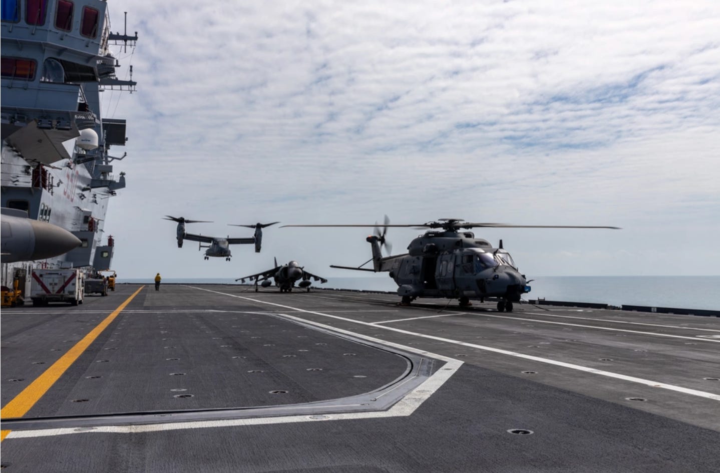 Talk about a diverse deck park on a light carrier. We have F-35B, AV-8B, MV-22, NH-90 … as it should be.