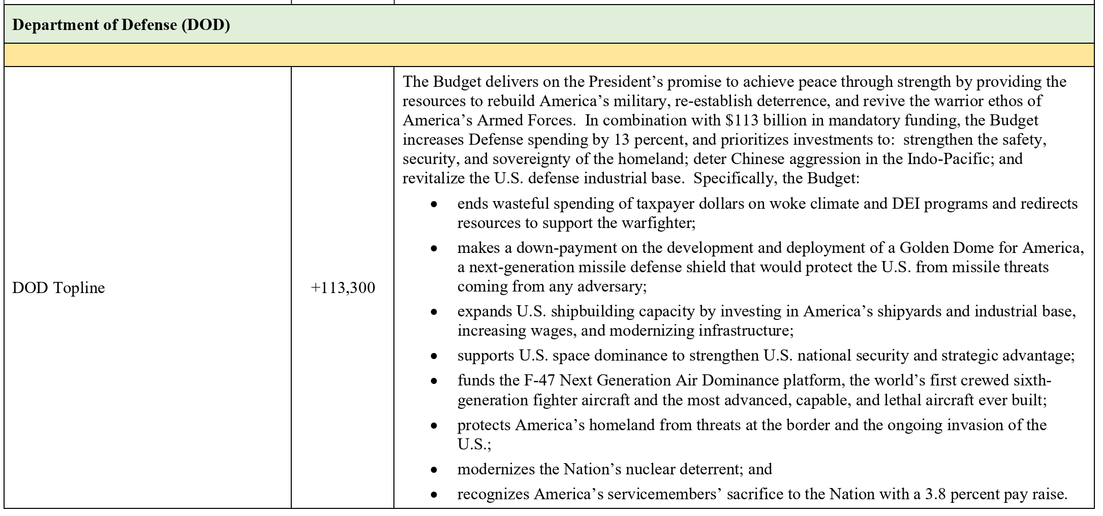 That bill includes $150 billion for defense, including many of Trump’s priorities, such as shipbuilding and missile defense. The administration could spend a large share of that money up front, but the bill hasn’t passed yet and includes funding available for the next several years, not in the upcoming fiscal year alone.
