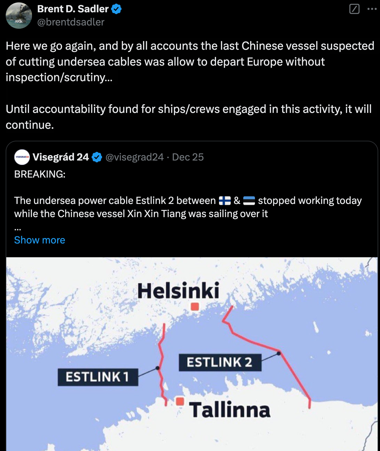 Yesterday’s incident involving undersea cables in the Baltic Sea is the latest in a series of suspected attacks on critical infrastructure. We commend the Finnish authorities for their swift action in boarding the suspected vessel. We are working with the Finnish authorities on the ongoing investigation. We stand in full solidarity with Finland, Estonia, and Germany.