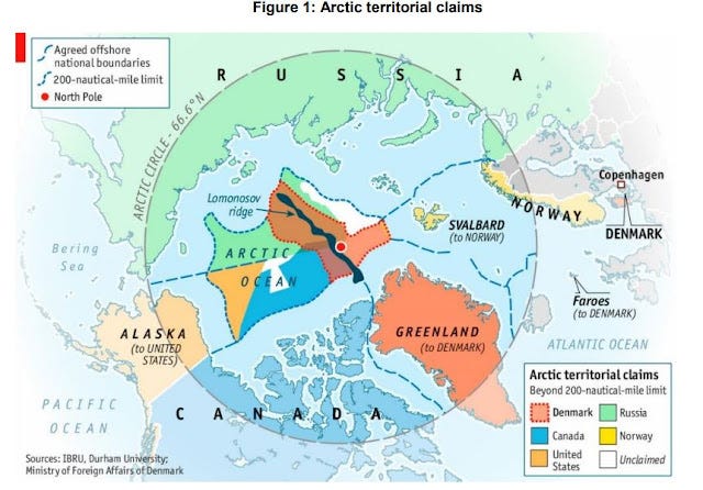 When you look at the playing board in the Arctic, the nations who have square-footage in the game are the USA, Iceland, Denmark, Norway, Canada, and Russia. You can even throw in the island nation of the United Kingdom as she is the dominate North Atlantic power outside the USA and any problem north of her can get existential real fast.