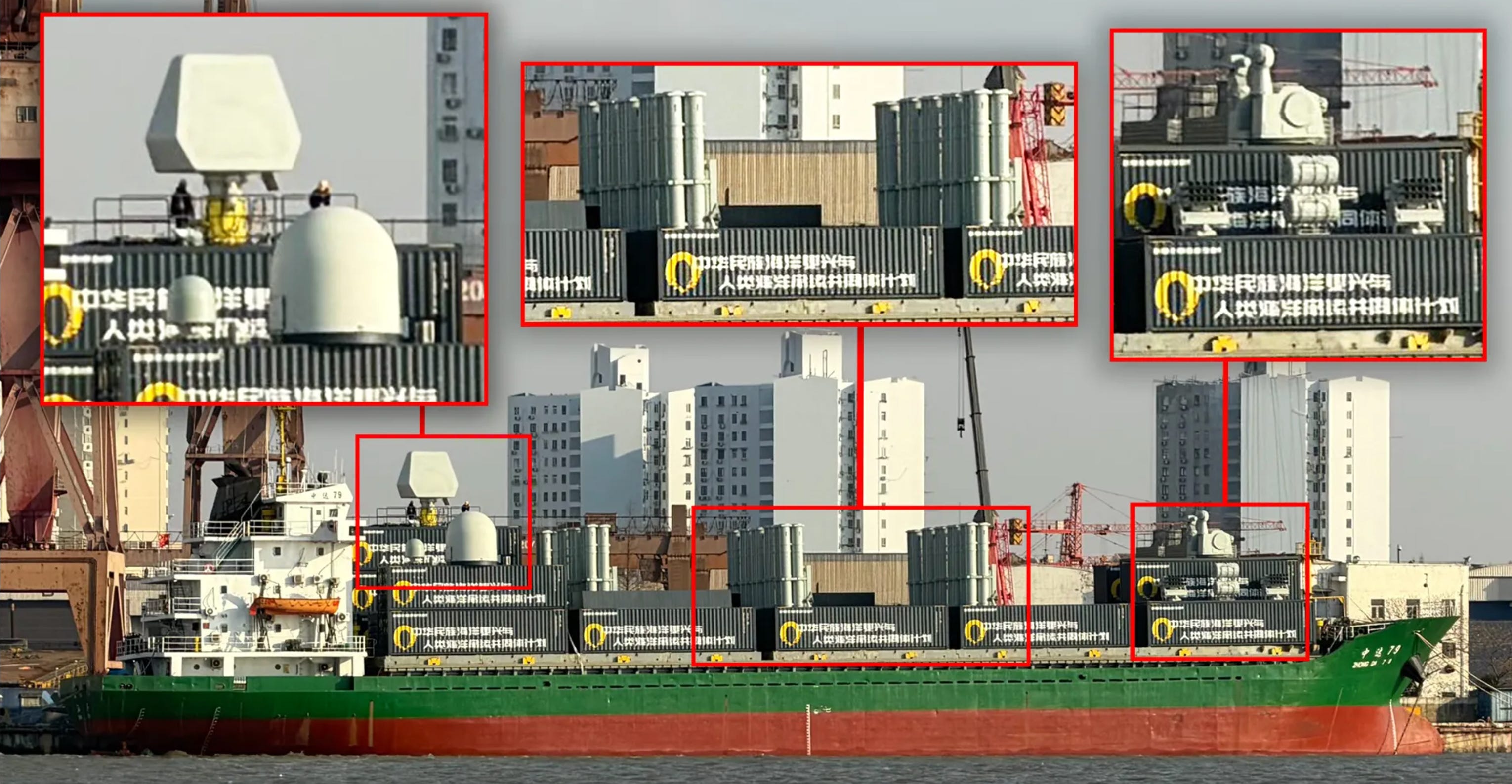 Near the bow of the vessel, high-up mounted above two containers, we see an Type 1130 30mm close-in-weapon system (CIWS) for last-ditch defense against incoming threats, especially cruise missiles. One container lower, on both sides, we see Type 726 decoy launchers mounted on top of another pair of containers. The large cylindrical pods appear to be emergency life rafts, likely required because of the expanded crew size to make a concept like this work.