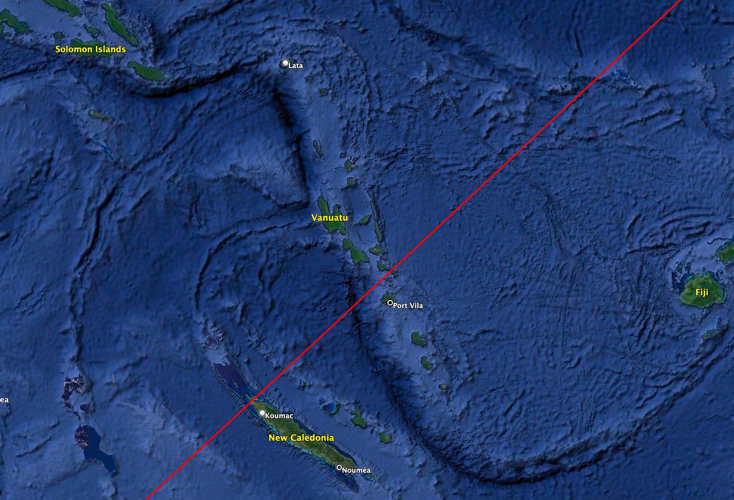 Look at the red line on the above graphic: it is the great circle route from California to Brisbane, Australia. I shouldn’t have to explain the importance and history, of the island chain in the upper-left-hand corner either: The Solomon Islands.