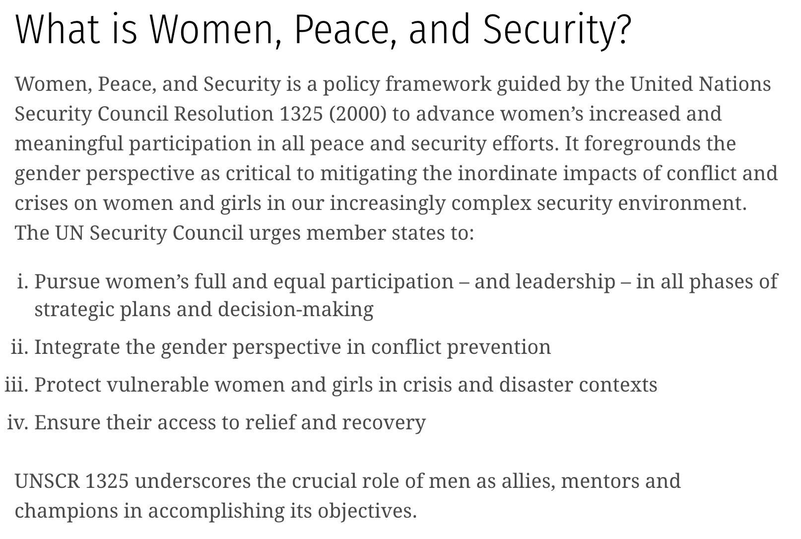 They key points to pull out of that to, “…advance women’s increased and meaningful participation in all peace and security efforts” and to ensure efforts “foregrounds the gender perspective” - when means it is up front.