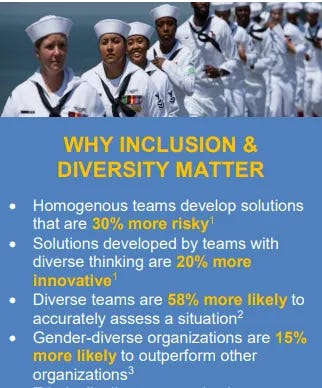 Whatever those Navy DIE bullet points say, it's easier leading a homogenous combat team that has shared experiences and deep bonds of trust. Men fight and die for the respect of their Squadies, not for God, Mother or some HR PPT brief