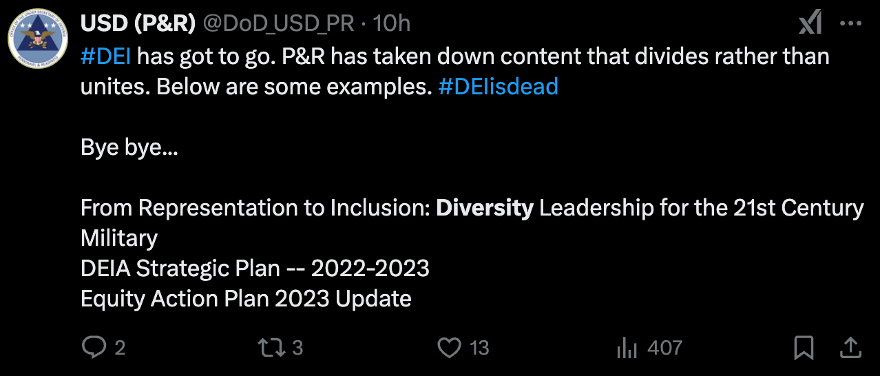 One example you can find of how this is being felt in the field is in an article in Breaking Defense by Valerie Insinna and Michael Marrow, DEI, DOA: How the defense industry is racing to bury its diversity efforts.