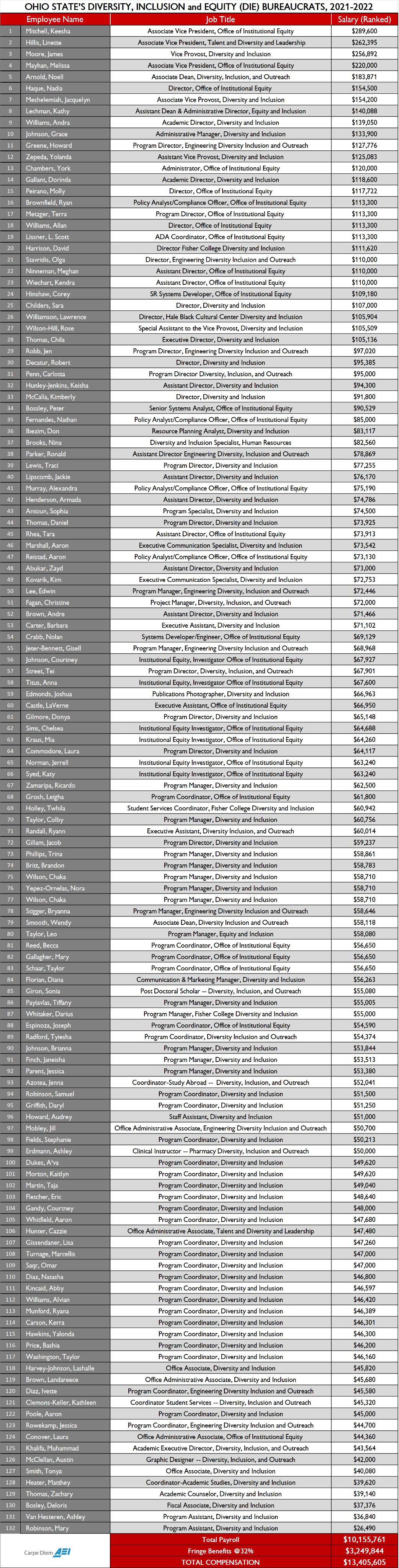 My favorite is $67K/yr for "Publications Photographer: Diversity & Inclusion". Michigan's not much better, they spend over $10 million a year on this nonsense. Perhaps what's most silly about all this is that they pretend today's universities are hotbeds of discrimination, when the campus is the most orthodox progressive institution that exists and is in many ways the source of the social contagion that afflicts us.