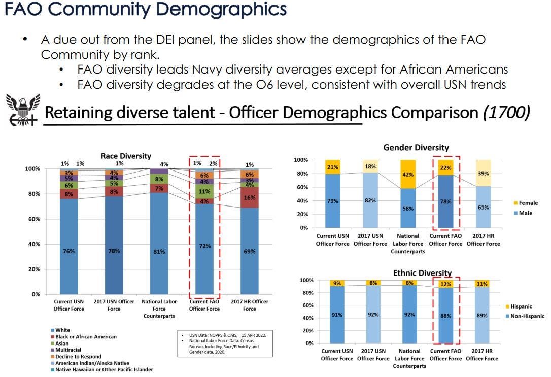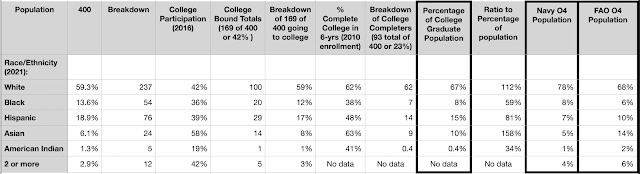 NB: this is simply an opening argument exercise. There are a lot of nuances to this variable that can adjust the numbers a few percentages here and there. Not all institutions are the same or are looked at the same. Not everyone has the same GPA. Not every degree is as desirable to the Navy as another. Performance in one objective area does not necessarily get reflected in another … but they are objective criteria. Having a college degree is just one variable but is arguably one of the most significant and rigid ones. It, like the others, has significant differences in results based on sectarian divisions of race and ethnicity that the Navy’s branch of the diversity industry likes to track in order to justify its job.