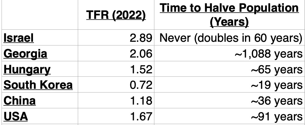 Assuming that Israel, Georgia, Hungary, South Korea, and the People's Republic of China's total fertility rates of 2022 were to remain consistent and there was zero net migration, how long until their populations are cut in half?