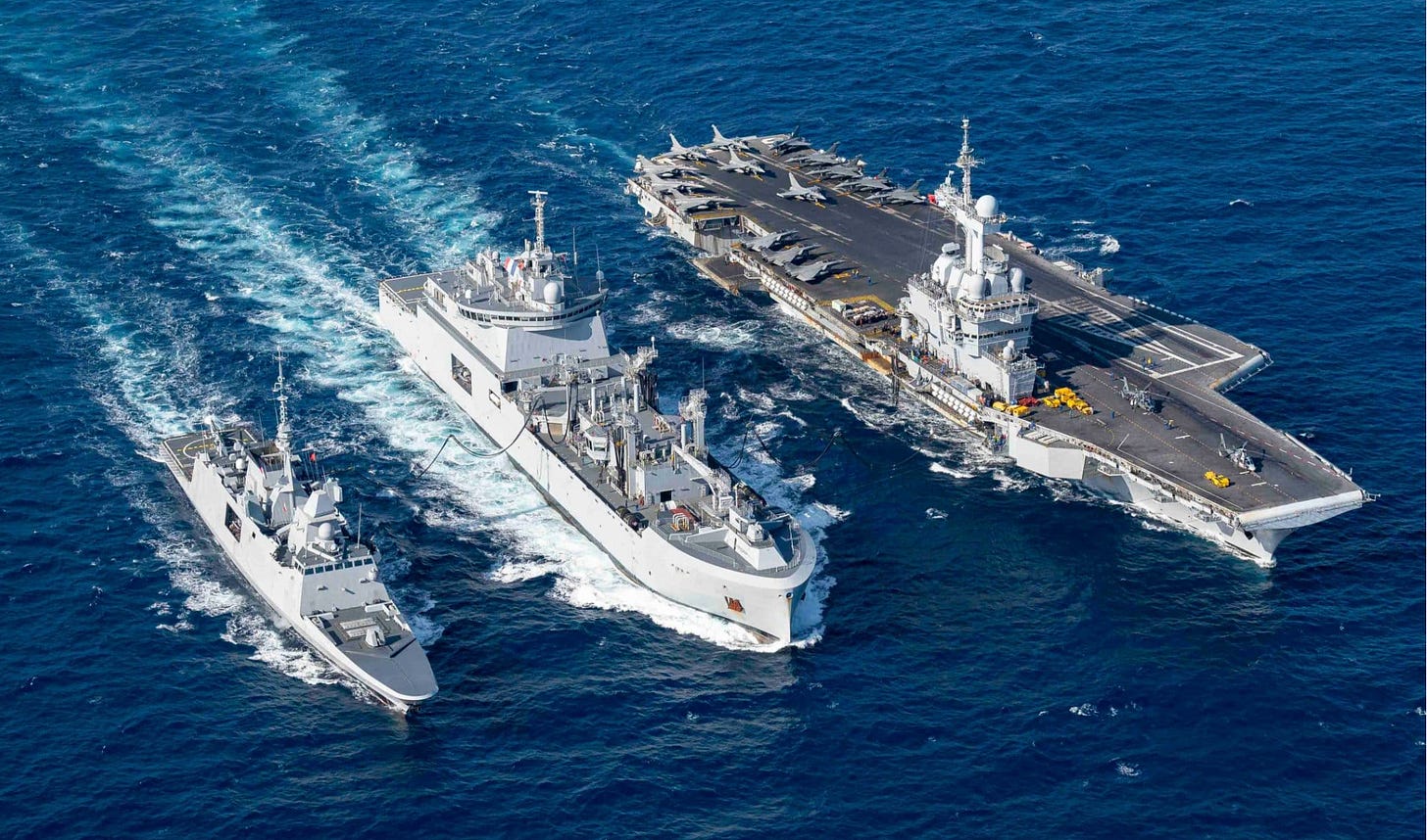 The carrier group includes the air defence destroyer FS Chevalier Paul (D621), a FREMM-class frigate, a fleet oiler for logistics support, and a nuclear-powered attack submarine.