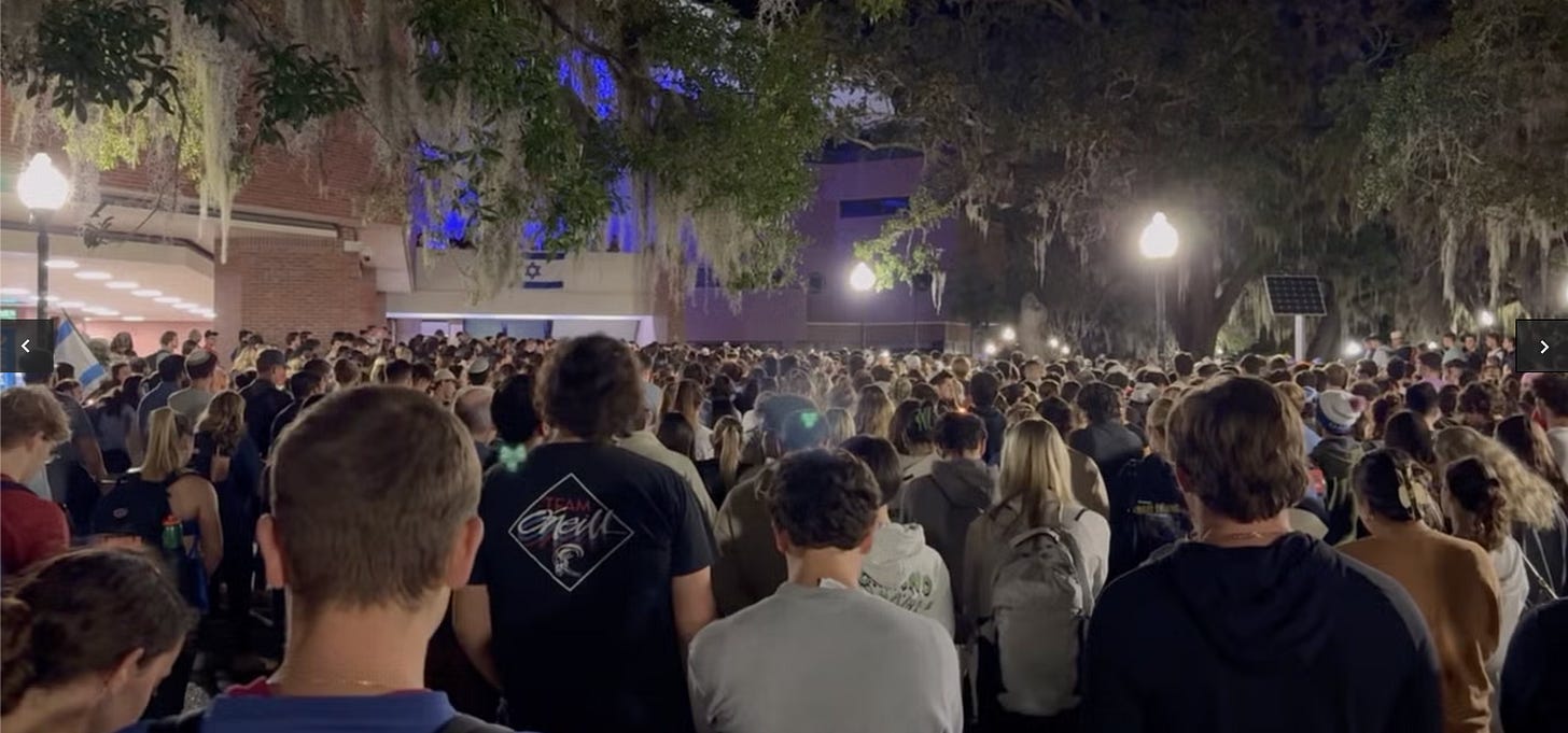 Many of you have reached out about the vigil at UF last night. I was overwhelmed to see a thousand Gators standing with Israel. You can find my remarks here.