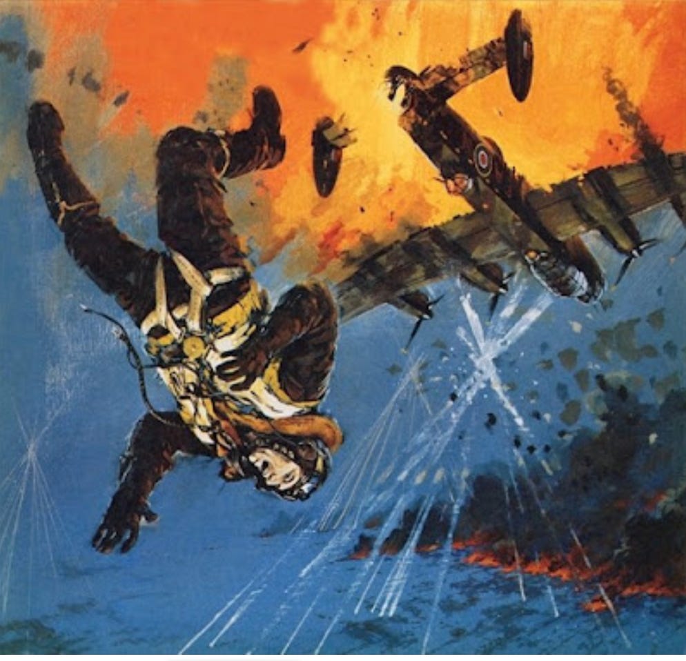 Falling head-first, looking back towards the stars twinkling in the night sky, FS Alkemade, serenity itself, hurtled towards the ground at 120 mph. At some point in the descent, Alkemade lost consciousness, possibly his body’s reaction to the pain where the flames had licked around his skin. Above him, Werewolf exploded.