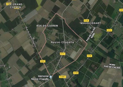 Neuve Chapelle village lies on the road between Bethune, Fleurbaix and Armentieres, near its junction with the Estaires – La Bassee road. The front lines ran parallel with the Bethune-Armentieres road, a little way to the east of the village. Behind the German line is the Bois de Biez. The ground here is flat and cut by many small drainage ditches. A mile ahead of the British was a long ridge – Aubers Ridge – barely 20 feet higher than the surrounding area but giving an observation advantage.