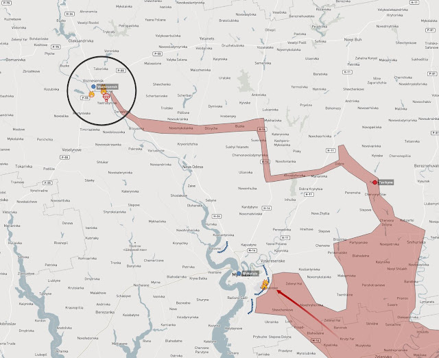 In preparation, Yevgeniy Velichko, the mayor of the city and one of the Ukrainian commanders, stated that local businessmen helped Ukrainian forces create numerous roadblocks and destroyed a bridge over the Mertvovod River [uk] in Voznesensk, as well as digging out the shoreline of the river so that Russian vehicles couldn't ford it.[3]