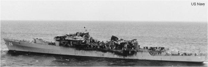 We were on plane guard. They put us on a plane guard because their TACAN was down. We had been making this same maneuver to port eight or nine times a day – from the start of the turn to completion was 3600 yards. This time we made a turn to starboard. I’ve read the investigation report, so even though I was down in the fire room, I’ve since come to know what happened up on the bridge. With the lights of the carrier looking the same, there was confusion, and miscommunication, and we made a right-hand turn this time, and the arc was half of what it had been for the last 15 or 20 times. We were going to stop, let them go past us, come across the wake, and get back in position, but we couldn’t determine what their position was. So, I’m in the phone booth, and the next thing I know, we’re getting all these bells. I said, “Okay, everybody, be alert.” Usually on this shift there is nothing going on—no exercises or drills, and the off-watch crew is watching the movie. I was actually writing a letter to my wife and I put it down in the phone booth. The engineering spaces are very noisy, and the phone booth is a place where you could talk. I saw the shaft stop, and I said, “What the hell’s going on?” So I told the guys, “Everybody pay attention. Something’s going on.” And then they called “Captain to the bridge! Captain to the bridge!” on the 1MC general announcing system. I knew they would normally pass the word, “Commanding Officer, your presence is requested on the bridge,” and only if they couldn’t reach him on the phone, or send the messenger to find him in time. But I knew from when I was on Blandy, going to Viet Nam, that “If you hear this terminology, you know there’s a serious problem.” So, I said, “Okay, everybody, get up. Get up. Get ready. Something’s gonna happen.” And then all of a sudden the ship started to shudder, and I thought, “What’s going on?” And I looked over to the stack periscope. With the periscope, you can look out to see whether you’re smoking or not. And usually, if you were smoking it gets black at the bottom and it goes up to the top. What we didn’t know down in the fire room at that time was that when we hit, JP-5 fuel lines were cut up on the carrier, and fuel poured down onto our ship, and into the air supply for ventilating the engineering spaces. We had combination stacks and masts, called macks. All that fuel came down into the after mack. The forward mack never got any oil on it. All that fuel came down MY mack, and they estimated like 18 hundred gallons.