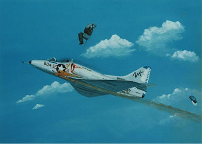 Busy Bee One, Two, Three, and Four turned toward their pre-briefed secondary mission, but before making much progress in that direction they were directed to support an ongoing SAR effort. An A-6A from CONSTELLATION had been shot down near the coast. The pilot survived the ejection only to land ¼ mile off shore and well within the range of enemy coastal mortar positions. After a series of frequency changes and then visually locating the A-6 crew, the lead A-4 (flown by the Blue Diamond Commanding Officer, CDR Ed Schaufelberger) called “Busy Bee 1, rolling in.” Then 2. Then Hugh. What followed is an amazing tale of luck (both good and bad), remarkable bravery and regrettable loss.