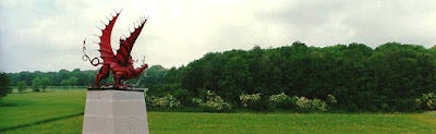 It is a beautiful place today when you drive by it, but then you notice a curious red dragon facing a wood.