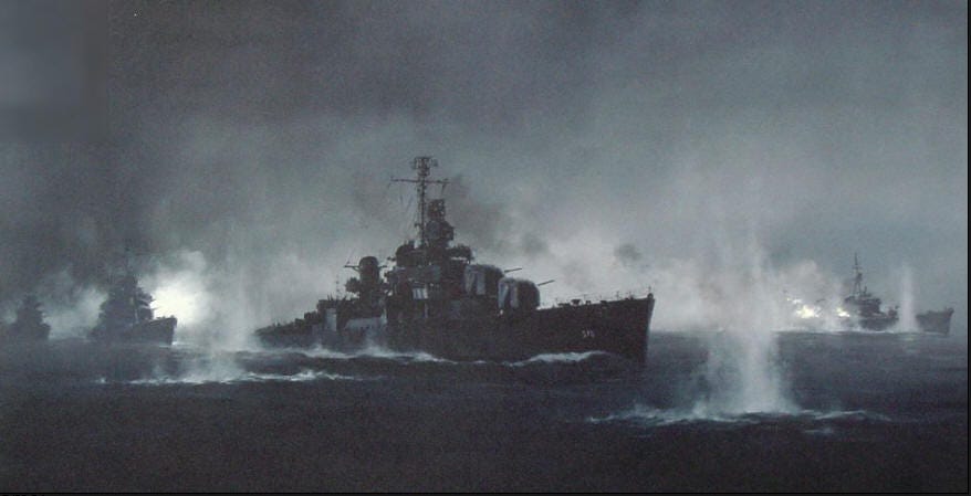 ... Using their relatively new radar technology on the moonless, dark, overcast night, Burke’s squadron fired more than a dozen torpedoes and sank both ships, finishing off one of the Japanese destroyers with surface guns.