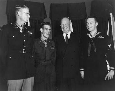 West stands with two other Medal of Honor recipients shortly after receiving their medals from President Dwight D. Eisenhower. From left: Edward R. Schowalter, Jr., West, Eisenhower, and William R. Charette