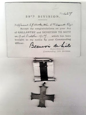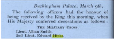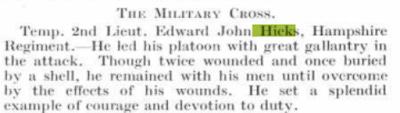 Say hello to Lieutenant Edward John Hicks, MC, British Army, 2nd Hampshire Regiment. He was awarded theMilitary Cross for bravery at the Battle of Passchendaele in 1917. After fighting for the first two years of the war as an enlisted man, he was brought up from the ranks and completed officer training in 1916.
