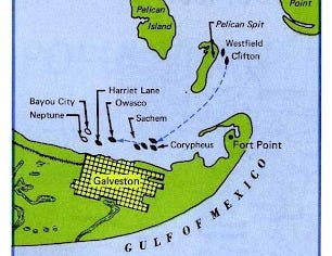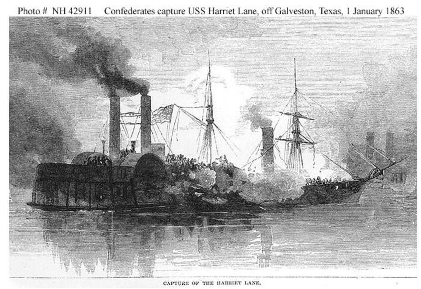 The Confederates entered Galveston on New Year's night, January 1, 1863, and opened fire before dawn. Cook failed to seize the wharf because of the short ladders provided for his men. Naval guns helped drive back the assault. Then the Confederate "cottonclads" struck from the rear of the Union squadron. The Harriet Lane sank the Neptune when it tried to ram the Union ship, but men from the Bayou City boarded and seized the federal vessel despite the explosion of their own heavy cannon. Renshaw's flagship, the Westfield, ran aground, and the commander died trying to blow up his ship rather than surrender it. The other Union ships sailed out to sea, ignoring Confederate surrender demands, which could be enforced only upon the abandoned federal infantry in town.