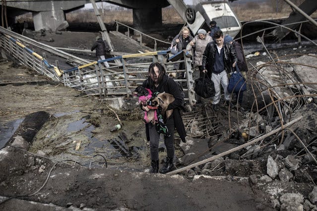 With a bridge over the Irpin River blown up, they have to climb down and under the span and then navigate a precarious pathway, their suitcases and pets in their hands. There was no formal agreement with Russia on the humanitarian corridor here, Ukrainian soldiers said, and the risk of a Russian shell hitting the area, something that happened before, was constant.