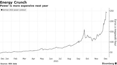 Atomic plants are designed to generate power around the clock, providing valuable backup when the wind doesn’t blow or the sun doesn’t shine. While the shutdowns have been known about for years and are unlikely to cause a spike in prices, the removal of 4 gigawatts of baseload output highlights a dwindling reserve of buffer capacity in Germany. It’s one reason why prices are higher next year: electricity for delivery in 2022 has jumped more than fivefold this year.