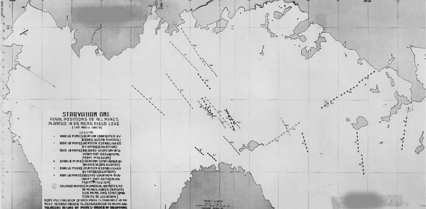 I have a pretty solid idea why Admiral Moorer was such an advocate of mining. As a naval aviator in WWII, Admiral Moorer would have been very familiar with one of the most accurately named operations of the war: Operation Starvation: