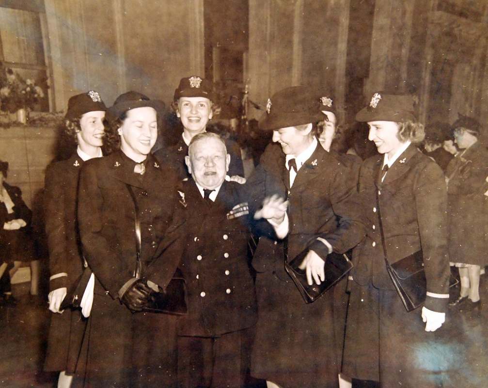 I suspect (but can't be sure, of course) the pronouns were she/her for these WAVES surrounding him in the picture: