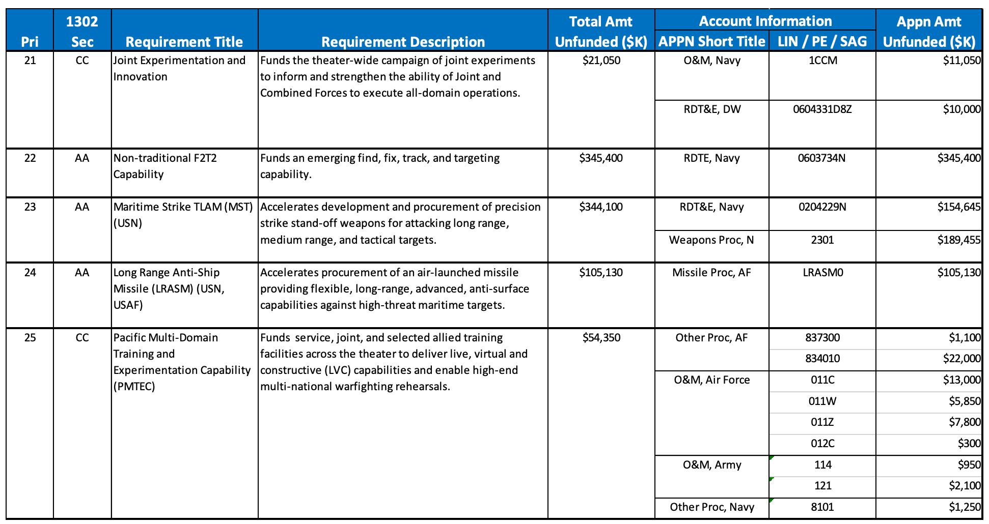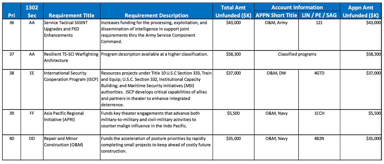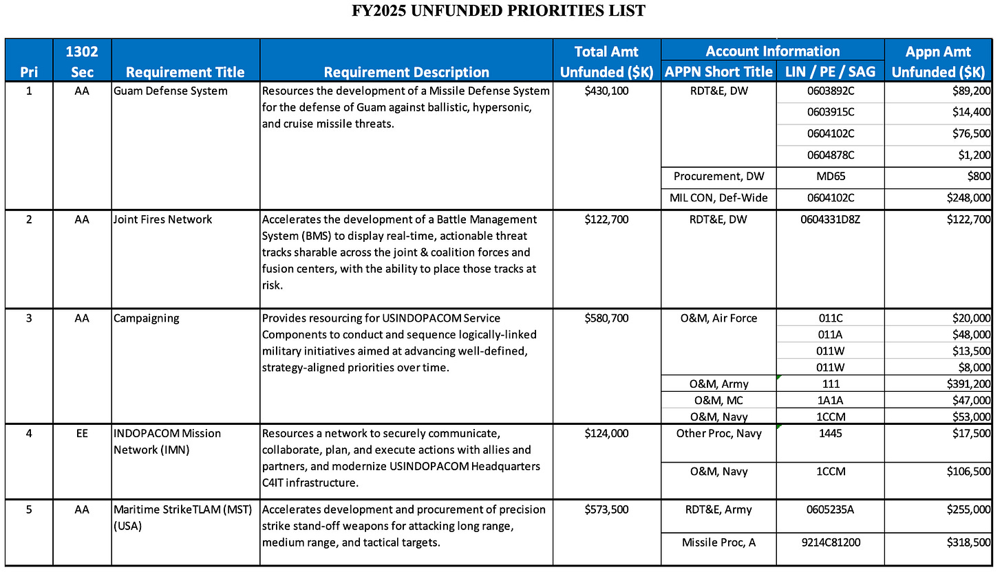 INDOPACOM Unfunded Priorities for the FY25 budget