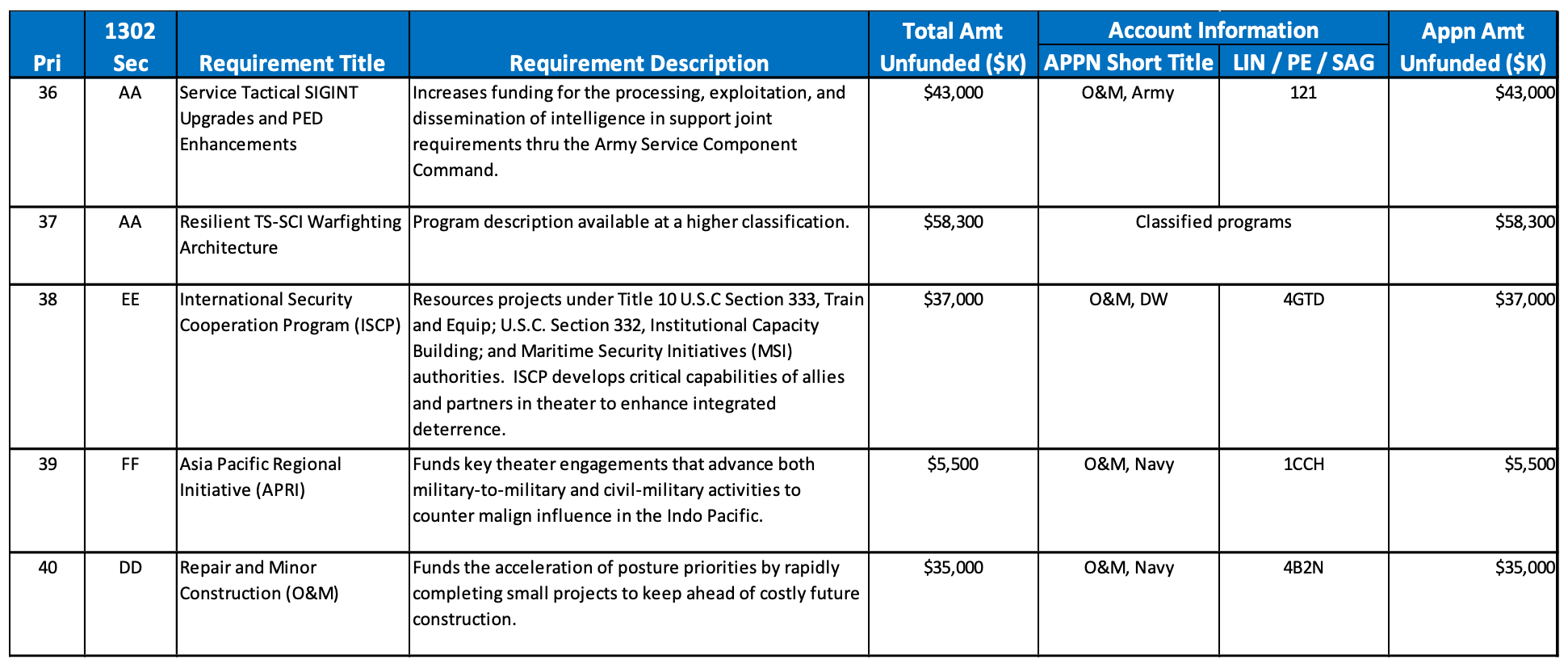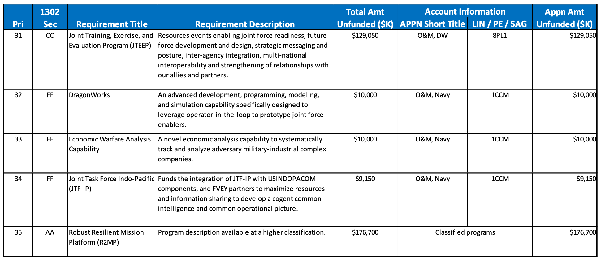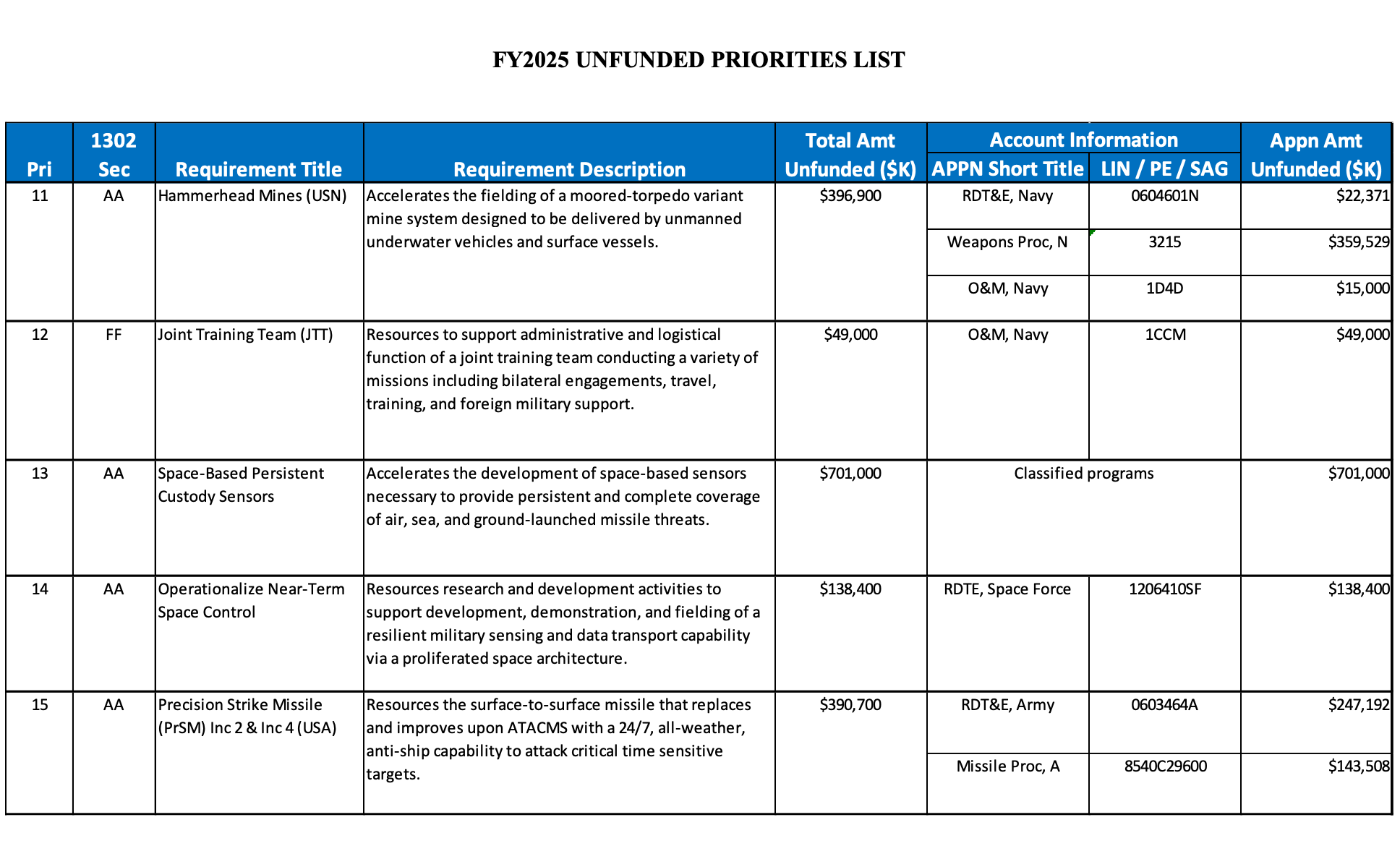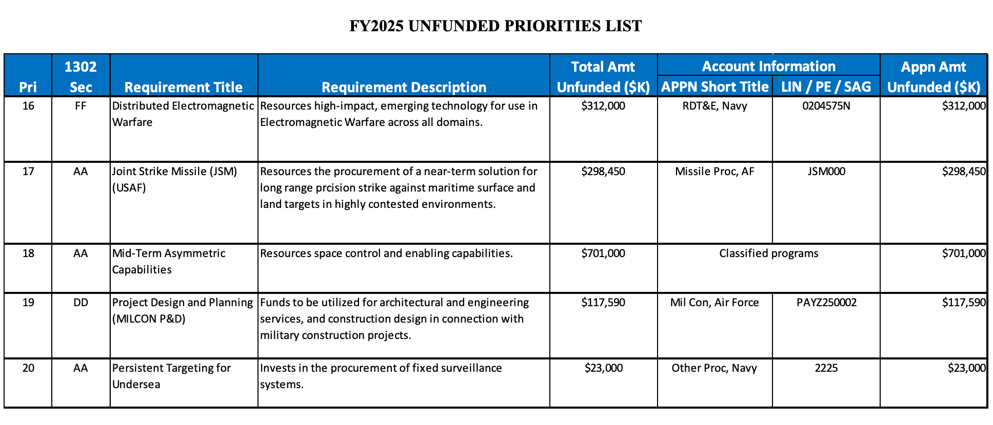 I’ve always loved unfunded priorities lists. More often than not, they show the true disconnect between those who are asked to fight our wars and those in DC who have … perhaps other priorities.