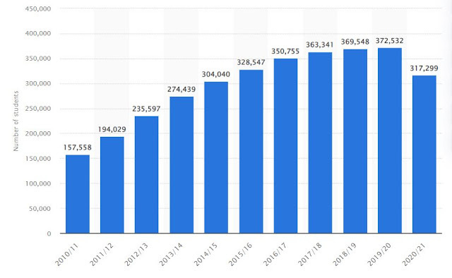 Even with the COVID effect, the numbers are staggering. Here's the number of college and university students from China in the United States from academic year 2010/11 to 2020/21 :