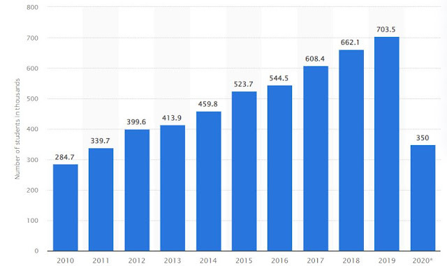 Note the decline to the USA is not the same as the decline globally. Here's the number of students from China going abroad for study from 2010 to 2020;
