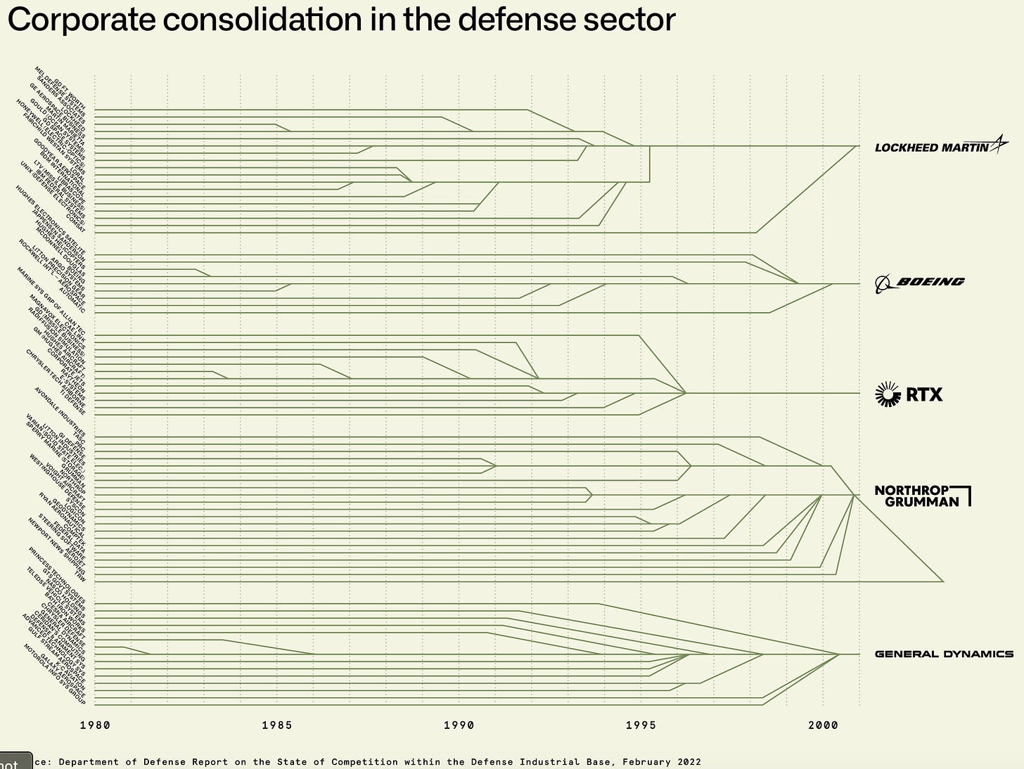 The most important consequence of the Last Supper wasn’t a reduction in competition in the Defense Industrial Base, but the decoupling of commercial innovation from defense and the rise of the government Monopsony. Consolidation bred conformity and pushed out the crazy Founders and innovative engineers. This was the Great Schism of the American Industrial Base.