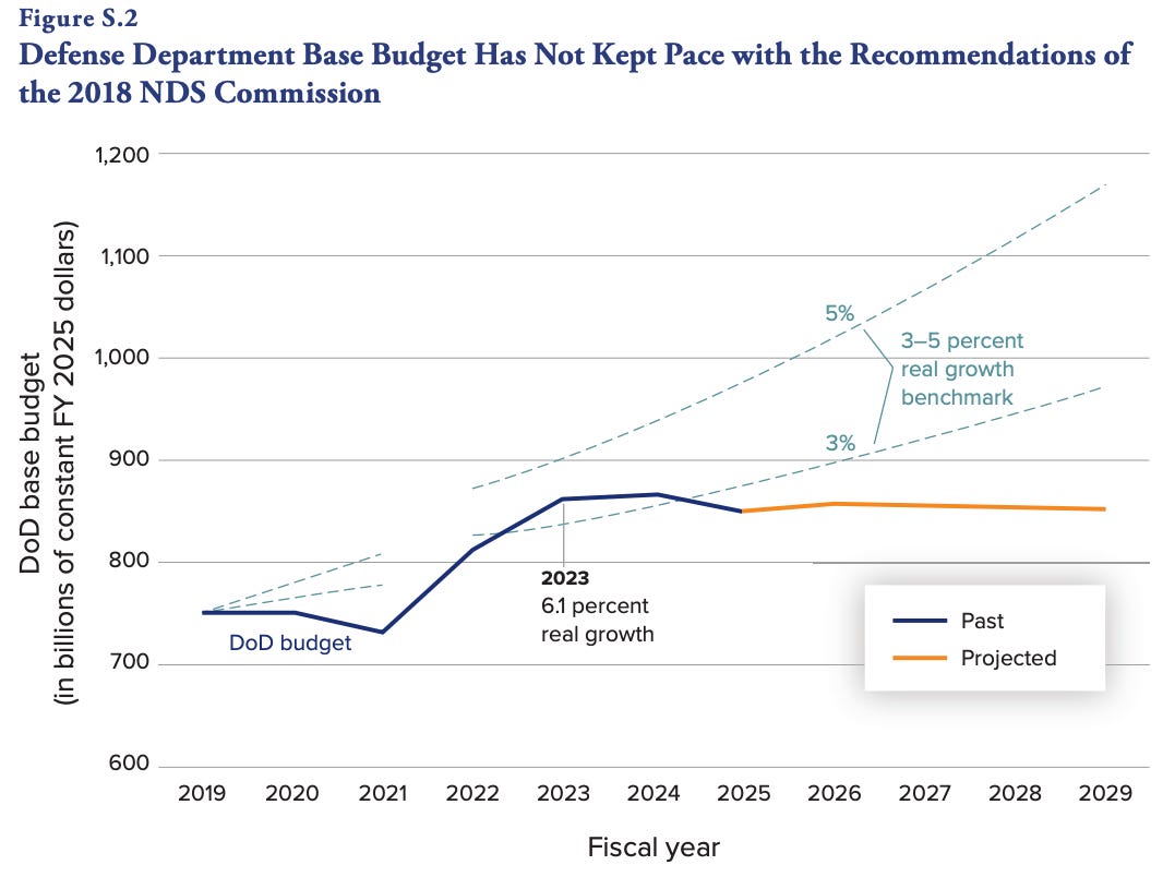 – For FY 2025, real growth in defense and nondefense national security spending is needed and, at a bare minimum, should fall within the range recommended by the 2018 NDS Commission. While the reforms recommended above are being made and investments in capacity from the supplemental appropriation are underway, increased spending should be allocated to emphasize near-term readiness demands to restore and reinforce deterrence.
