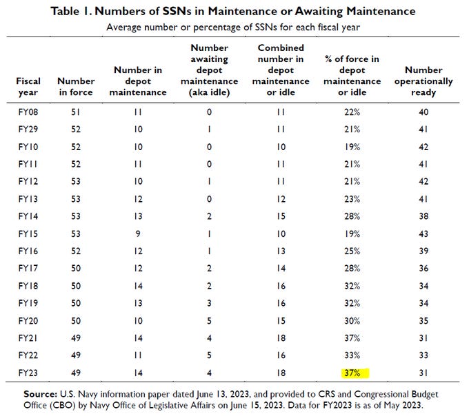 15-years later in FY23 we have 49 SSN, 96% of the boats we had in FY08, but only 31 operationally ready, only 78% of what we had in FY08.