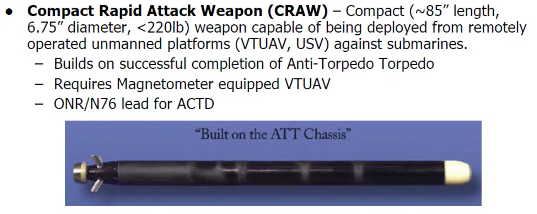 “CRAW TI-1 effort acquisition strategy is to fund Penn State University Applied Research Laboratory (PSU-ARL) to complete modification of the existing very-lightweight torpedo design leveraged from the ATTDS program. The CRAW TI-1 effort is being executed as a Middle Tier of Acquisition (MTA) effort and will rapidly develop fieldable prototypes to demonstrate the new very-lightweight torpedo ASW capabilities in an operational environment.”