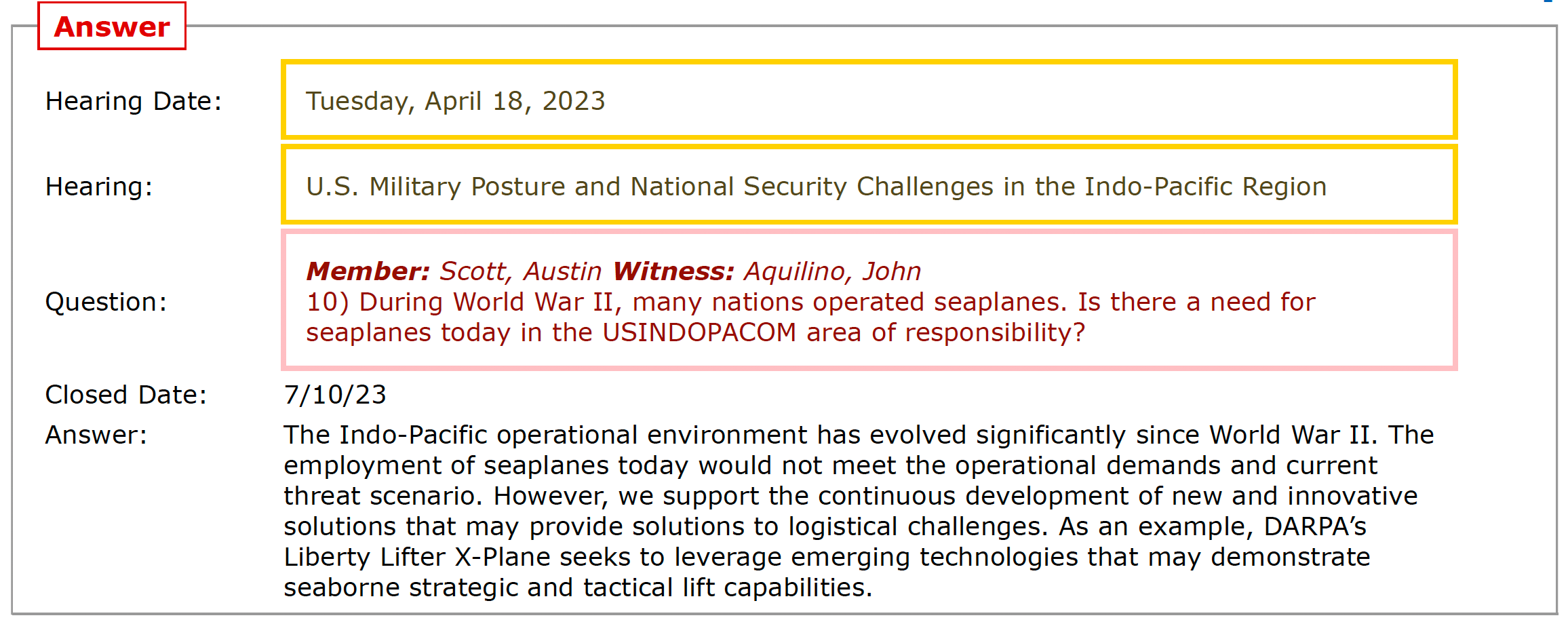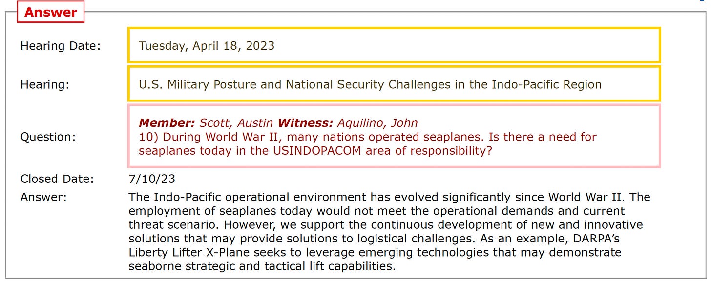 “As an example, DARPA’s Liberty Lifter X-Plane seeks to leverage emerging technologies that may demonstrate seaborn strategic and tactical lift capabilities.”
