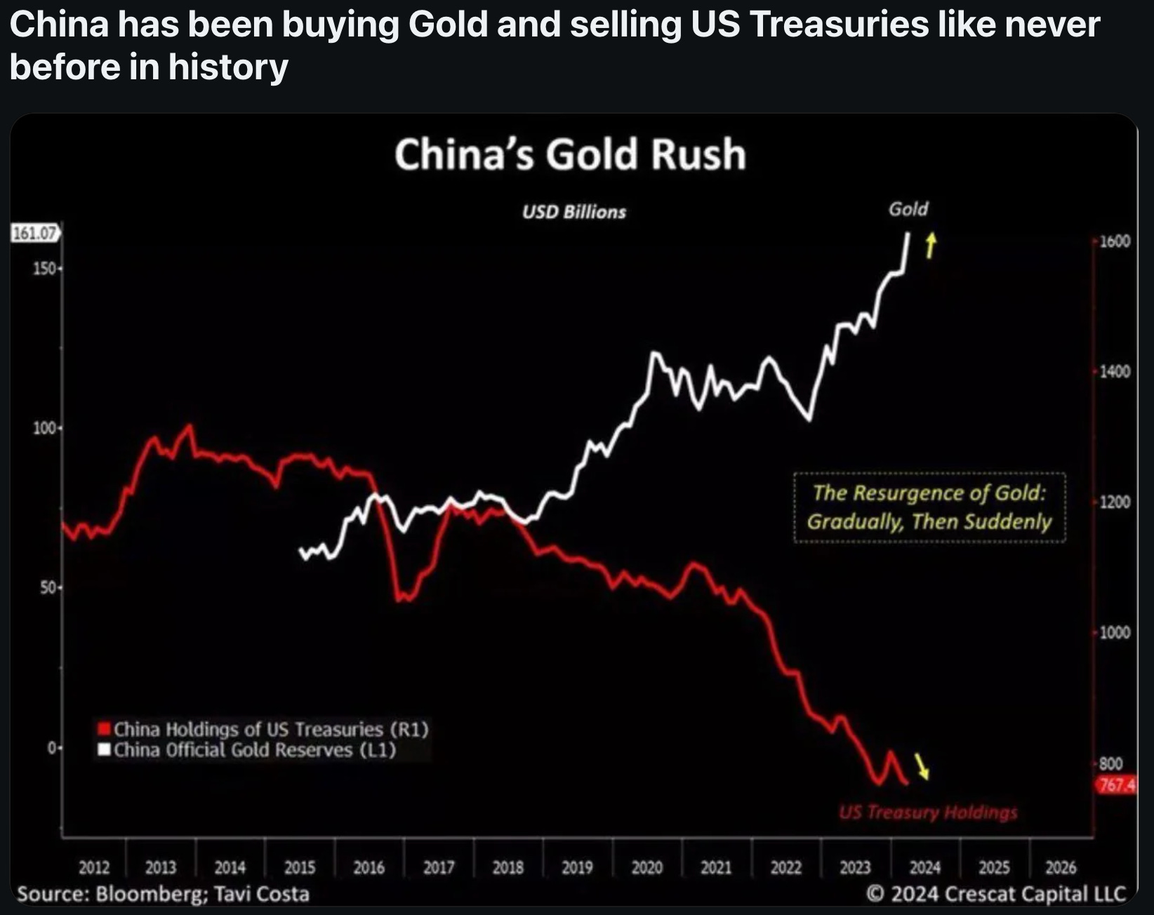 COA Most Likely is that they’ve made a decision that it is not in their interest to be holding so many of the debt instruments of their primary competitor on the world stage. COA Most Dangerous is that they want to sell what looks good at peace—interest bearing debt instruments—to what you need at war: gold.