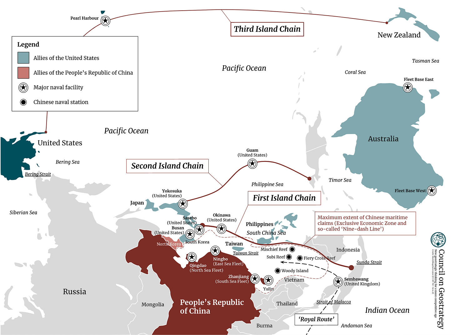 They have exactly the opposite maritime view as the United States. We have broad, open access to the Atlantic and Pacific Oceans. The PRC, on the other hand, is facing what from a distance is a series of barrier islands held by unfriendly powers.
