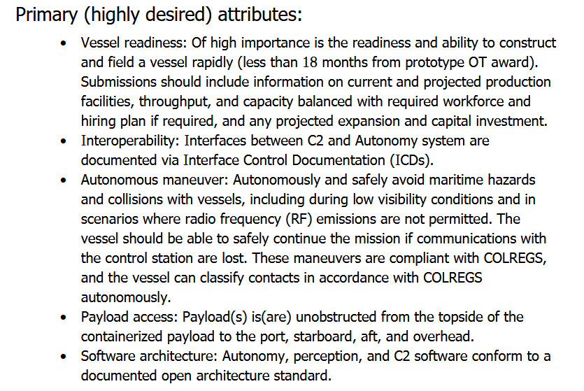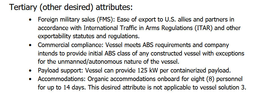 …NAVSEA’s recent MASC contracting notice says. “The desired vessel solution should have the ability to carry a minimum of four (4) FEUs containerized payloads that weigh 36.3 MT each and consume up to 50 kW each. The technology solution should maximize speed and range to the extent practicable.”