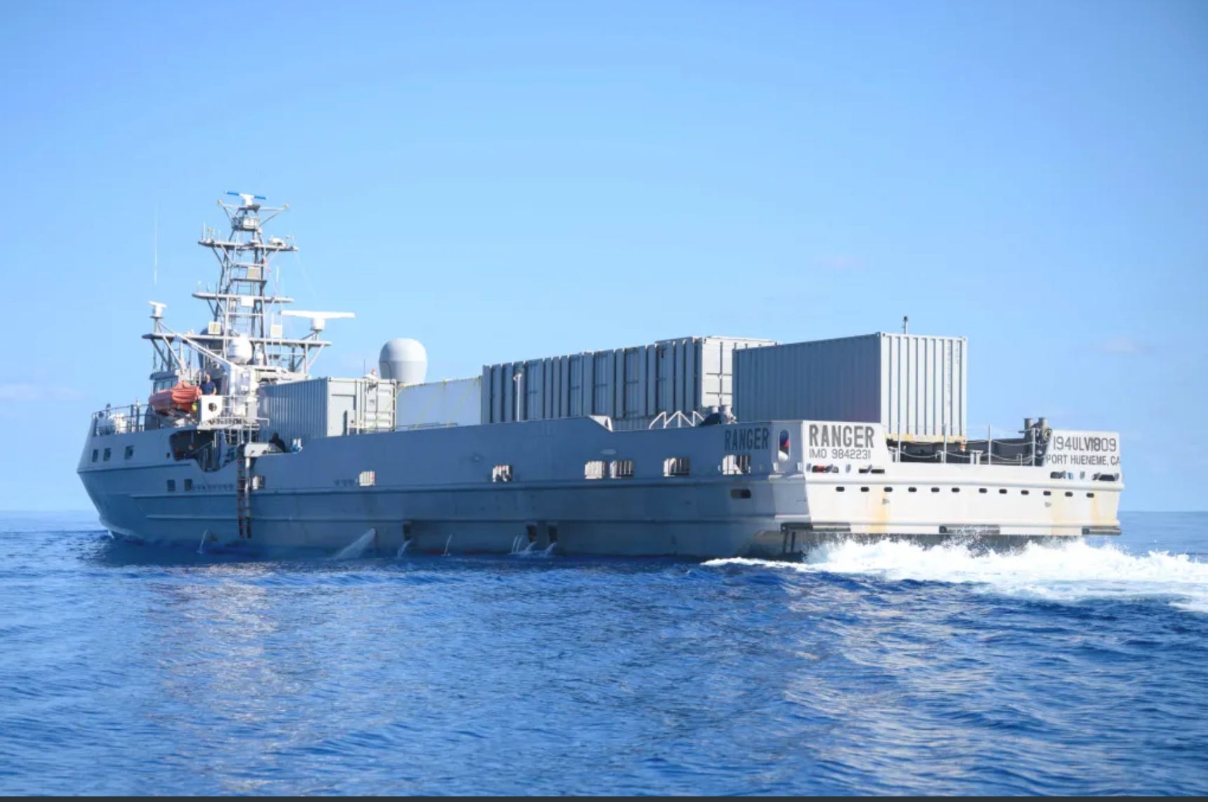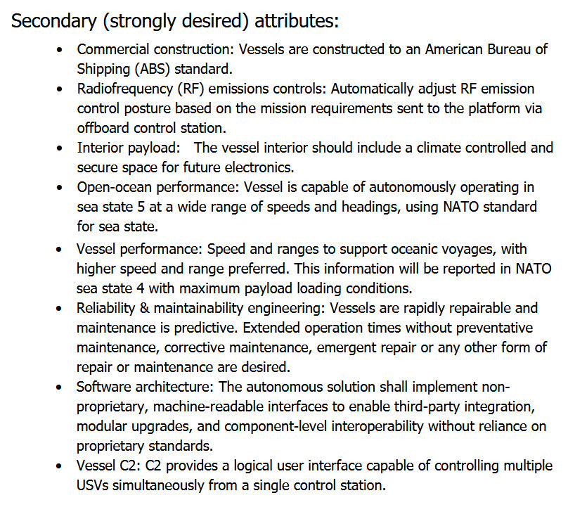 “The desired [baseline MASC] vessel solution should carry a minimum of two forty-foot equivalent unit (FEU) containerized payloads that weigh 36.3 metric tons (MT) each and consume up to 75 kilowatts (kW) each,” the notice says. “While carrying 25 MT on the payload deck, the vessel should achieve a minimum range of 2,500 nautical miles (nmi) while maintaining at least 25 knots, at all times, in NATO Sea State 4.”