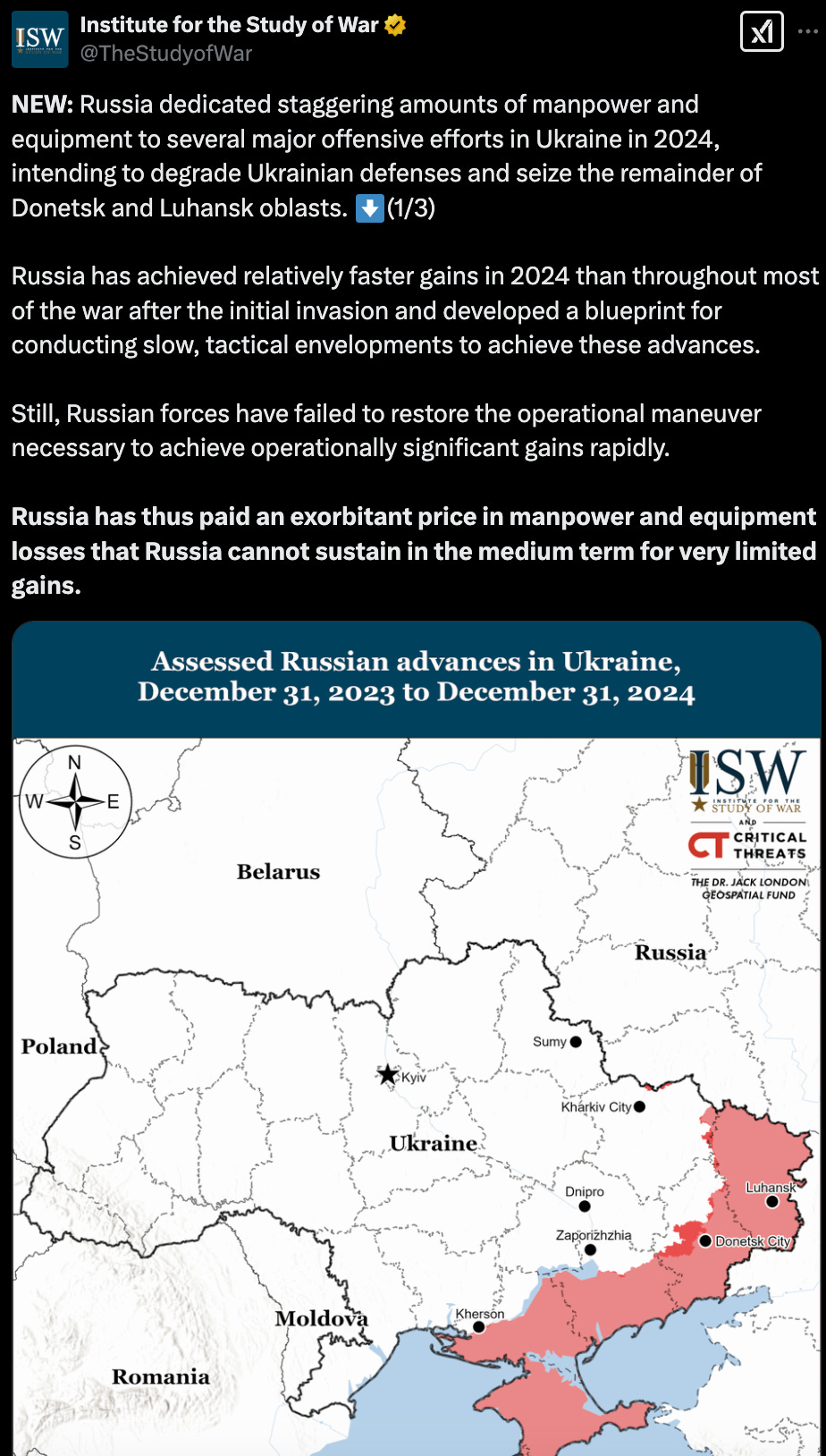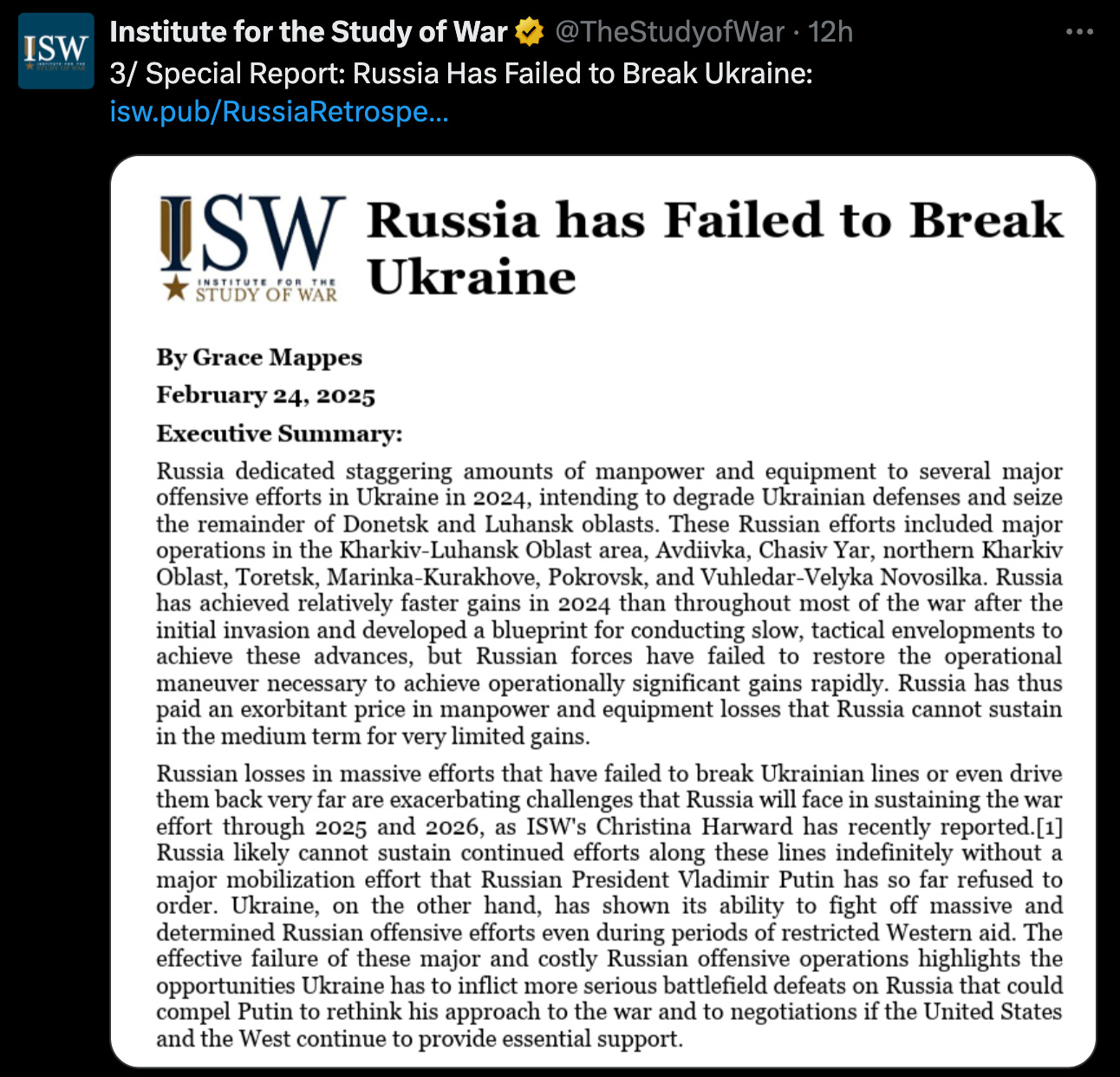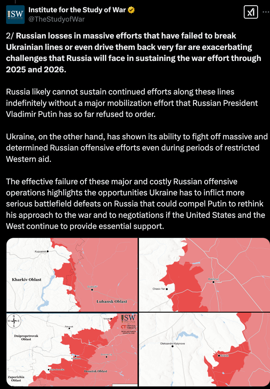 Fickle Friends: Ukraine cannot support its own warfighting requirements, but Russia mostly can. There is a theory that Russia is about to fall off a cliff as they burn through the last of the Soviet era reserves, but how accurate is that? I don’t know. What I do know that both the USA and Europe have more leverage against Ukraine than they do against Russia. If the USA and Europe decide to force a Ukrainian accommodation to Russia, they will. If both decide to cut off Ukrainian support, Ukraine will collapse. Either way, if this continues to slog on and Russia’s government maintains a firm grip on power, eventually Ukraine will simply run out of Ukrainians to kill enough Russians to make a difference. The key is…can Russia sustain the losses? I am not one to underestimate the ability of Russia to sustain losses that would collapse other societies…but the Ukrainians have the same history. ISW has as good outline about how Russia may not be inevitable.
