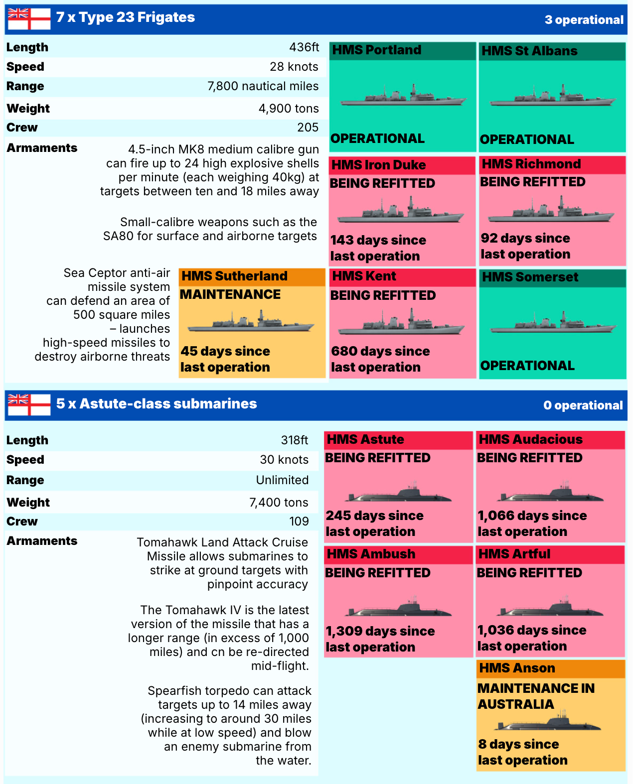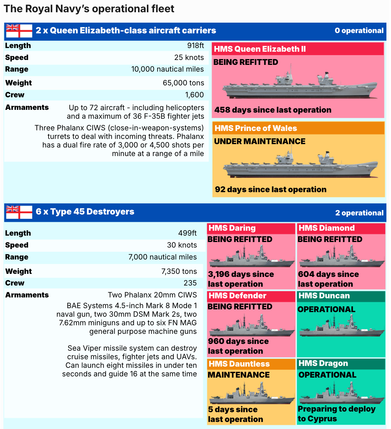 This graphic from The Daily Mail is helpful in understanding not just how small the Royal Navy has become, but how few of its warships are even ready to go to war.