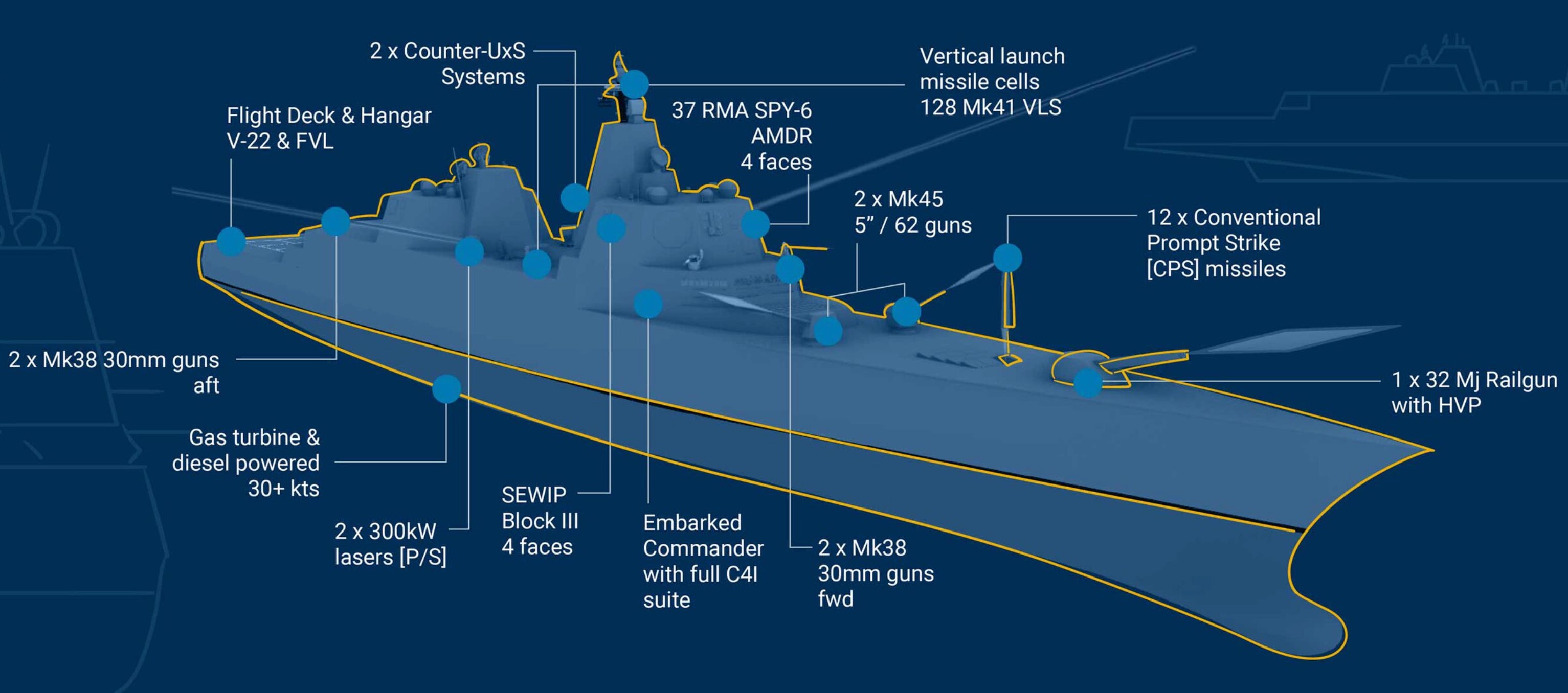 DDG-1000. We were once going to have 32 of these. We got three. Its main weapon, the two 155mm guns, were never made operational and are being removed. The ships are being turned into weapons demonstrators for Conventional Prompt Strike. I hear great things about the engineering plant, but they have yet to do a proper deployment, nine and a half years after the commissioning of hull-1.