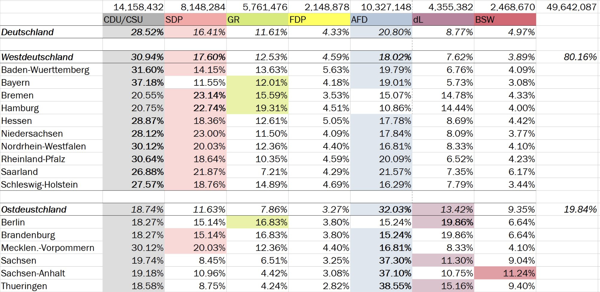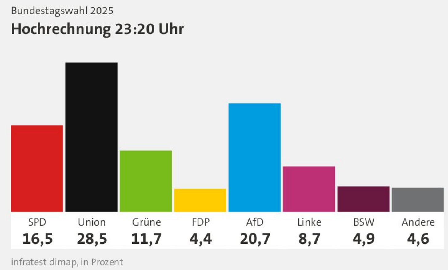 If those numbers hold +/- a seat or two, that would give a Union-SPD government 329 seats, a 13 seat majority. Glory to all—that keeps the Greens out of government, as the CSU in Union will not enter government with them at all.