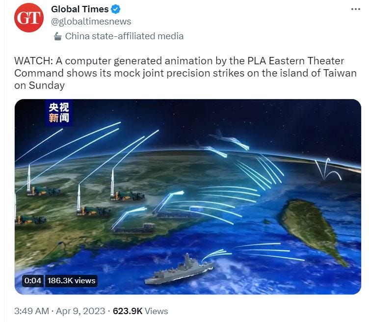 Beijing launched the drills on Saturday, a day after Taiwan’s President Tsai Ing-wen returned from a 10-day visit to Central America and the United States where she met US House Speaker Kevin McCarthy.