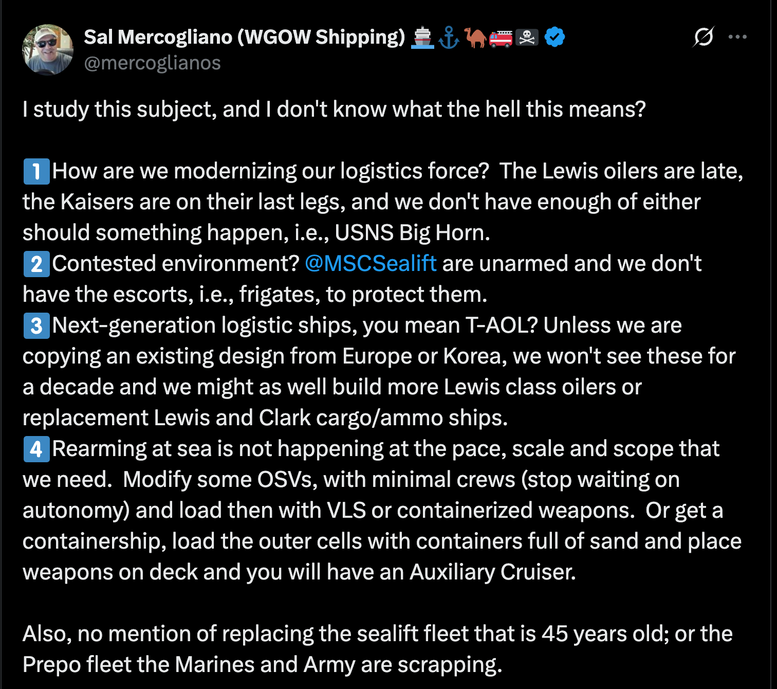 The hour is late, yet even in this year of our Lord, Two Thousand and Twenty Five, on the 6th of May at the HASC Readiness Subcommittee Hearing, the highest ranking officer of the service that will have to lead any fight west of the International Date Line is unable to even articulate the problem IN HIS WRITTEN TESTIMONY.