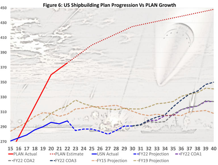 "The FY23 Shipbuilding Plan proposes a 10-year drop in fleet numbers that deviates in spirit from every shipbuilding plan since 2012. During this dangerous decade, the FY23 Shipbuilding Plan returns the fleet to a size that precipitated the period of panic that inspired Congress to enshrine the 355-ship goal into law (Figure 2). The FY23 Long Range Shipbuilding Plan will miss the defunct, minimum goal of 300 ships by another decade, and is less likely to meet the Navy’s legal and operational 355-ship requirement."