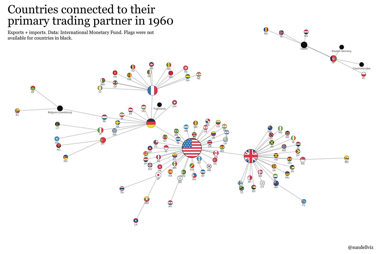 Our European NATO allies (AKA, core of the EU), well passed recovery from WWII under the USA’s security umbrella, have moved into their own trading block (by natural design). The Soviet Union (through Austria as a distribution hub for hydrocarbons) gives a hint of Europe’s future reliance on Russian energy, but is still an economic afterthought. And there is the PRC, off in its own little economic world with other 2nd tier communist/socialist nations - making its appearance on the stage.